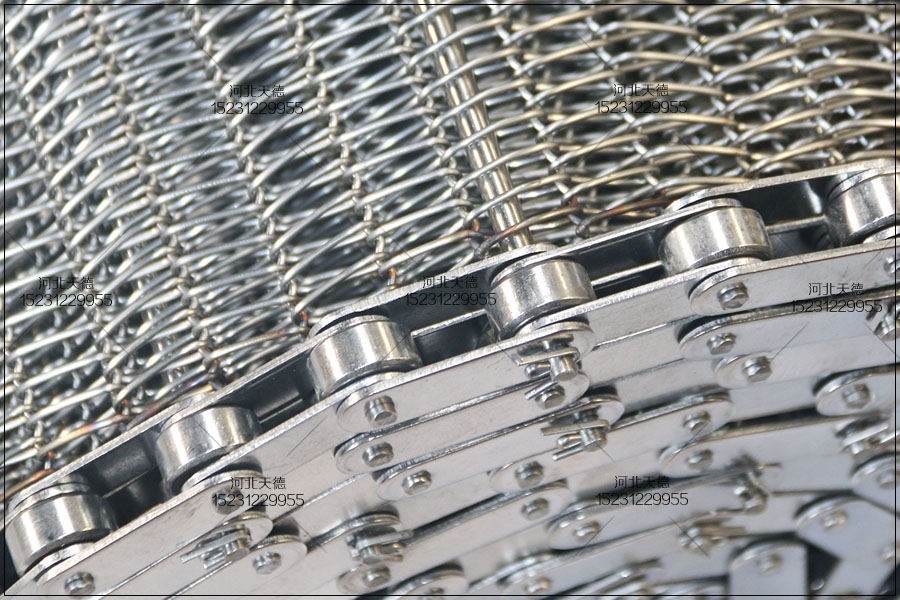 鋼絲編織鏈條輸送帶:長度50米,輸送面積寬度460mm,鏈條節距38.1mm,串桿直徑8mm,串桿間距:3節一根,絲直徑:1.2mm,鋼絲編織螺距8mm,鋼絲編織節距15mm,擋邊高度3公分,擋邊厚度1.2mm,全部材質不銹鋼304材質,耐高溫耐酸堿耐腐蝕。