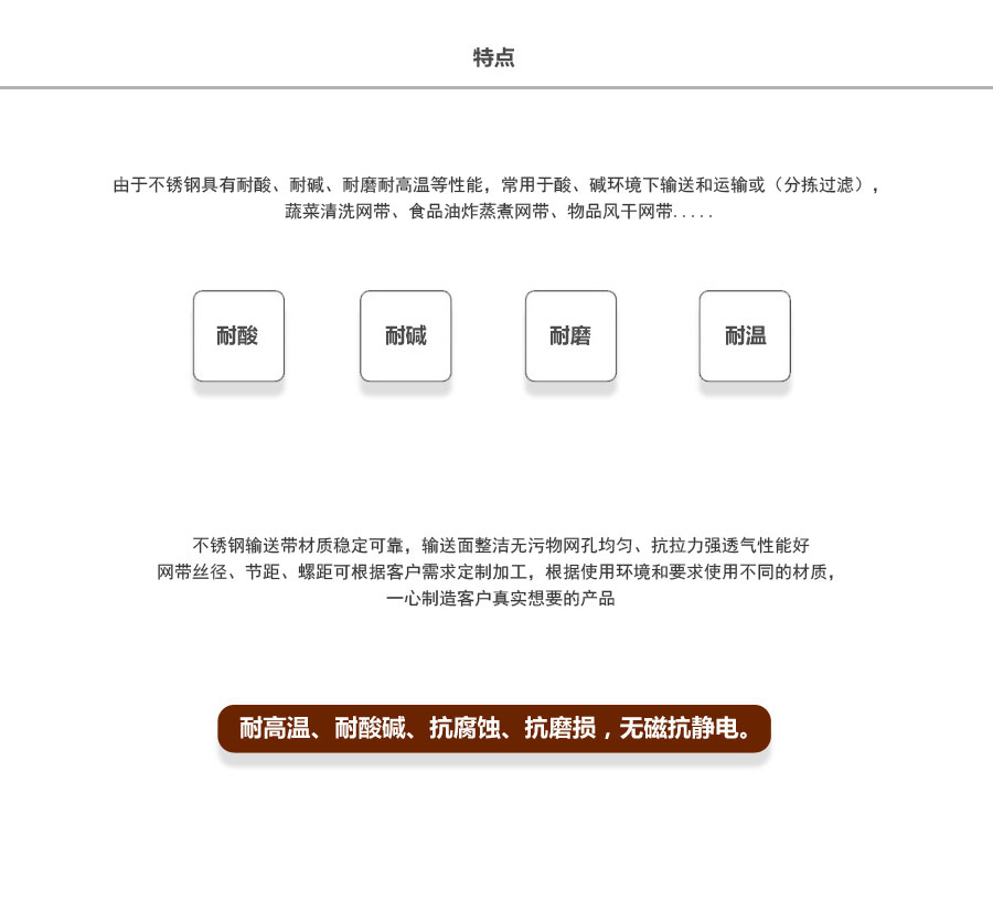 不銹鋼網(wǎng)帶屬于非標(biāo)準(zhǔn)件,我們將根據(jù)你提供的規(guī)格長寬,材質(zhì),不銹鋼絲線徑,編制結(jié)構(gòu)尺寸,支軸直徑,支軸間距,鏈條型號(hào)等數(shù)據(jù)制作.