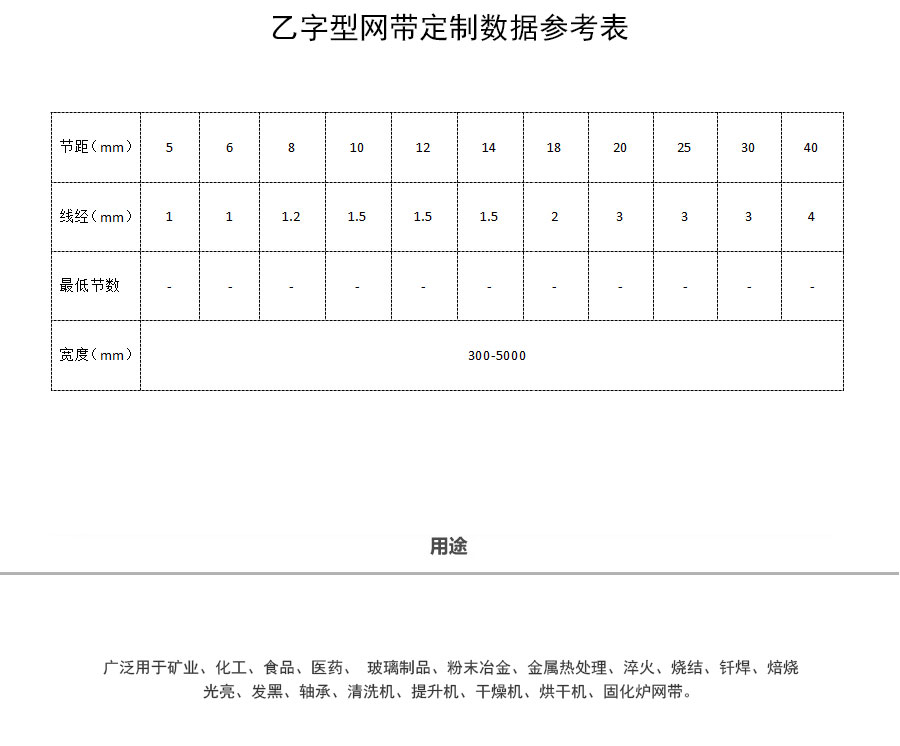 乙字型網(wǎng)帶簡介:乙字型網(wǎng)帶又稱乙型網(wǎng)帶、食品網(wǎng)帶、巧克力網(wǎng)帶,節(jié)距分隔一般按用戶要求定制,屬非標(biāo)準(zhǔn)輸送網(wǎng)帶。