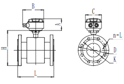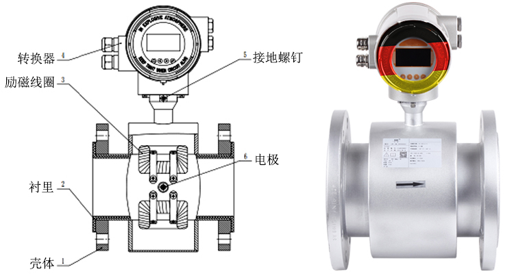 電磁流量計測量原理是基于法拉第電磁感應定律。流量計的測量管是一內襯絕緣材料的非導磁合金短管。兩只電極沿管徑方向穿通管壁固定在測量管上。其電極頭與襯里內表面基本齊平。勵磁線圈由雙向方波脈沖勵磁時,將在與測量管軸線垂直的方向上產生一磁通量密度為B的工作磁場。此時,如果具有一定電導率的流體流經測量管,將切割磁力線感應出電動勢E。電動勢E正比于磁通量密度B、測量管內徑d與平均流速V的乘積,電動勢E(流量信號)由電極檢出并通過電纜送至轉換器。轉換器將流量信號放大處理后,可顯示流體流量,并能輸出脈沖,摸擬電流等信號,用于流量的控制和調節。