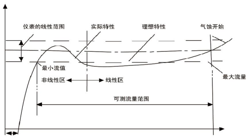 流量計的系數(shù)與流量(或靂諾數(shù))的關(guān)系曲線如下圖所示。 由圖可見, 儀表系數(shù)分為二段, 即線性段和非線性段。 線性段約為其工作段的三分之二, 其特性與傳感器結(jié)構(gòu)尺寸及流體粘性有關(guān)。非線性段特性受承軸摩擦力, 流體粘性阻力影響較大。 當(dāng)流體量低于傳感器流置下限時, 儀表系數(shù)隨著流噩迅速變化。 當(dāng)流噩超過流噩上限時要注意防止氣蝕現(xiàn)象。