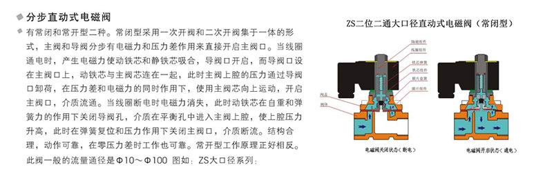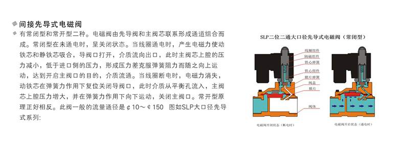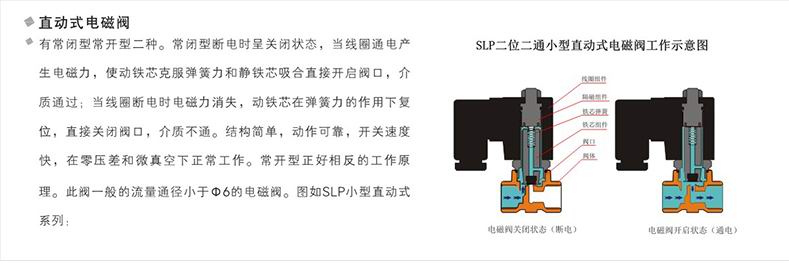 有常閉型和常開型二種。常閉型斷電時呈關閉狀態,當線圈通電時產生電磁力,使動鐵芯克服彈簧力同靜鐵芯吸合直接開啟閥,介質呈通路;當線圈斷電時電磁力消失,動鐵芯在彈簧力的作用下復位,直接關閉閥口,介質不通。結構簡單,動作可靠,在零壓差和微真空下正常工作。常開型正好相反。如小于φ6流量通徑的電磁閥。
